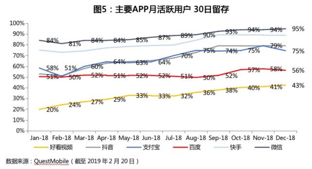 事实上,由于搜索属于断点需求,“百度”实际上是一个工具型APP,其用户留存率较低。以12月的活跃用户30日留存率为例,相比之前几年的红包玩家微信(95%)和支付宝(75%),百度的30日留存率仅为56%,显著低于竞手。(详见图5)