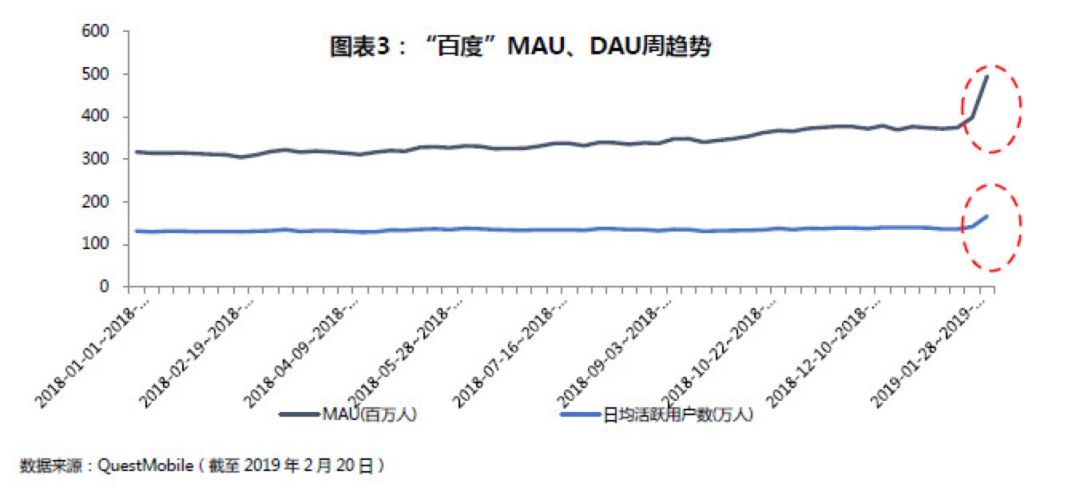 除此之外,QuestMobile公布的数据显示,2月4日-2月10日当周,百度MAU、DAU等运营数据均出现直线上扬。(详见图表3)