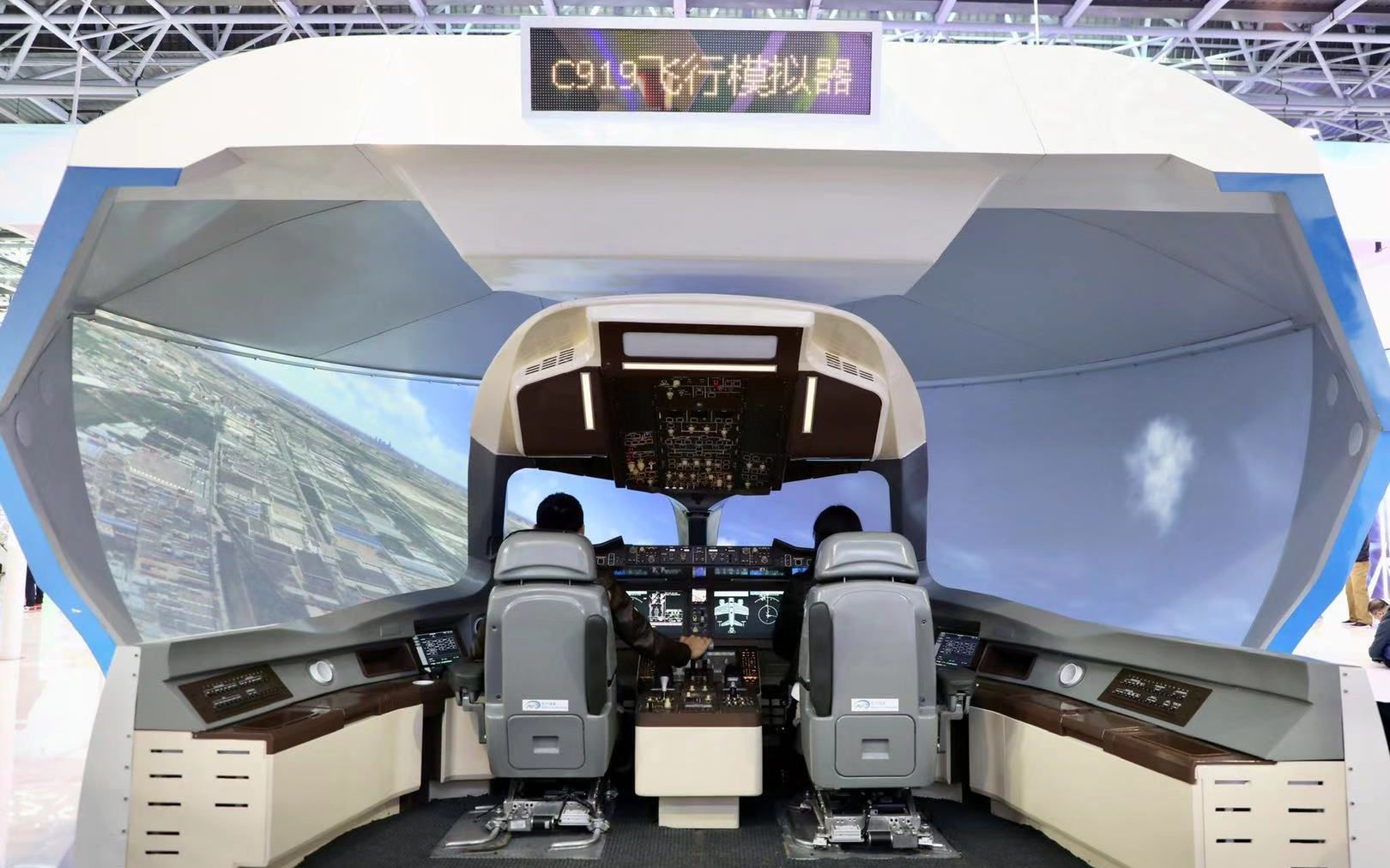 模拟机按照1:1比例还原了C919驾驶舱,观众可以体验试驾C919大飞机的感受。