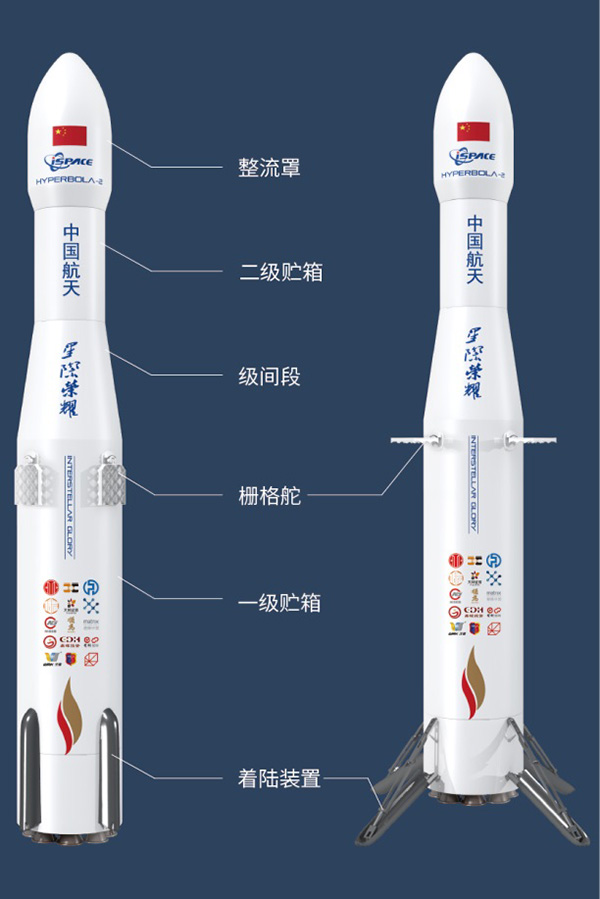 “双曲线二号”是星际荣耀独立设计、研发的一款可重复使用的小型液体运载火箭,采用两级串联构型,一、二级采用相同状态的15吨级可重复使用液氧甲烷液体火箭发动机,其中一级安装9台,二级安装1台。