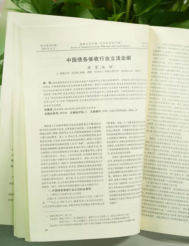 近日,《湘潭大学学报》在2019年第6期发表《中国债务催收行业立法论纲》一文,文章就当前中国债务催收行业立法的必要性、理论与原则、模式与规划、结构与内容等问题进行阐述。这是我国有关专家学者第一次对债务催收行业立法提出系统性构想,对中国金融市场秩序和社会诚信体系的构建,有着十分重要的意义。
