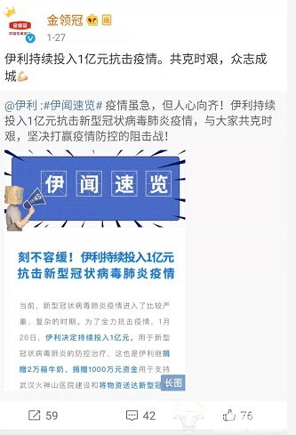1月26日,伊利集团再次投入1亿元用于新型冠状病毒肺炎治疗,为湖北省及内蒙古自治区疫情防控治疗研究、病人救治恢复、医疗工作人员关爱等提供现金、产品和物资保障。