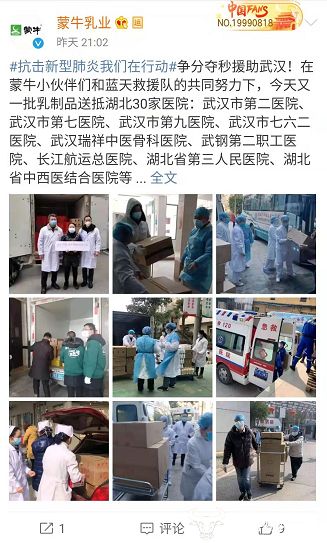 相对于伊利来看,蒙牛响应抗击疫情时间较早。在春节前1月22日,蒙牛就为武汉市第一医院送去蒙牛冠益乳等低温酸奶。随后,1月23日蒙牛为武汉大学中南医院捐赠2000提特仑苏牛奶;1月25日,蒙牛通过中华慈善总会捐赠1200万现金和价值800万的牛奶,其中1200万现金将用户成立“蒙牛重大疫情保障转向基金”支持抗击疫情一线的医务工作人员及相关疫情防治研究等。总体来看,在向武汉地区抗疫捐赠中蒙牛主要以本公司产品支援为主。