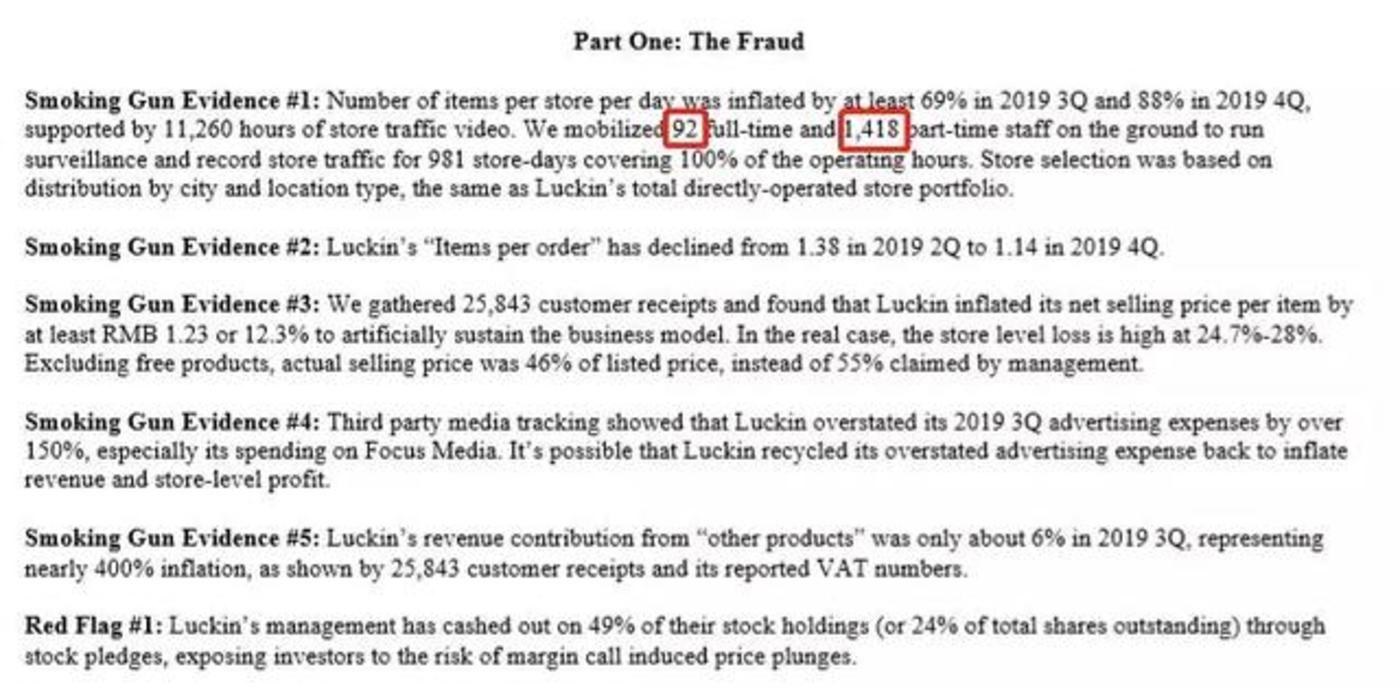 报告作者称,通过92个全职和1418个兼职调查员,收集了25000多张小票 ,进行了10000个小时的门店录像,并且收集了大量内部微信聊天记录,认为瑞幸的平均每店货物数据在2019年第三季度虚增69%,在2019年第四季度虚增88%。同时还指出,瑞幸将2019年第三季度的广告支出夸大了150%以上,尤其是在分众传媒上的支出。