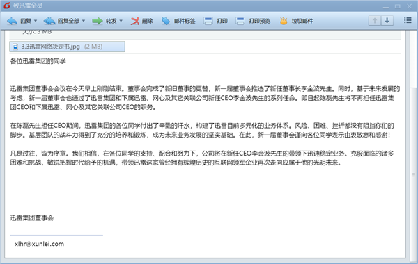 该内部信称:“我们相信,在各位同学的支持、配合和努力下,公司将在新任CEO李金波先生的带领下迅速稳定业务。克服面临的诸多困难和挑战,敏锐把握时代给予的机遇,带领迅雷这家曾经拥有辉煌历史的互联网领军企业再次走向应属于他的光明未来。”