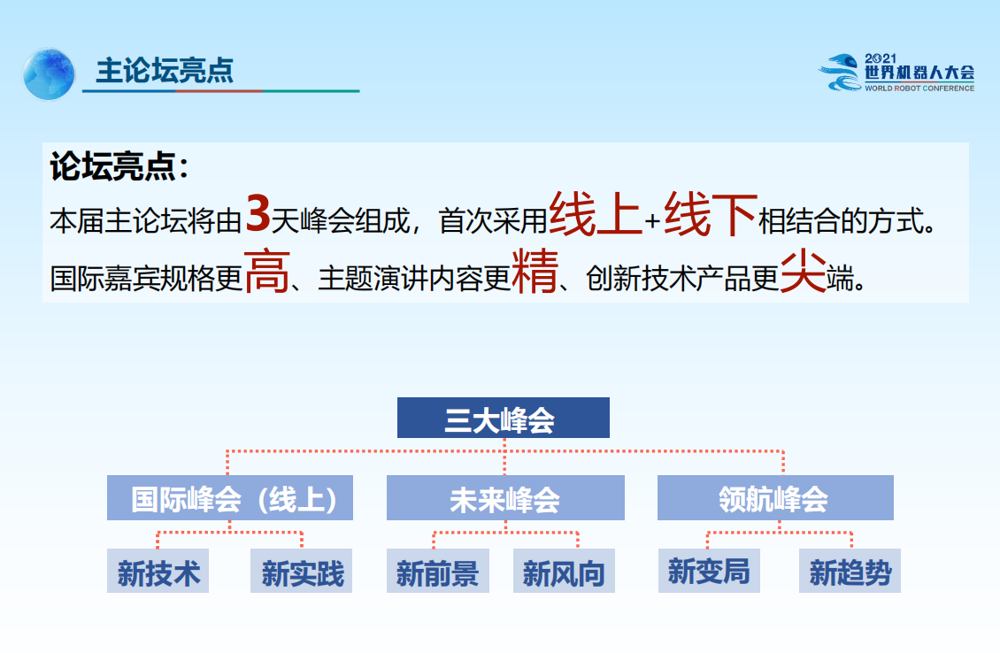 2021世界机器人大会秉承开放合作、共享普惠的理念,以“全球机器人产业命运 共同体”为价值倡导,展示全球范围内的先进技术和科研成果,促进国内外的学术交流, 共享新兴科技资源、共探广阔合作空间