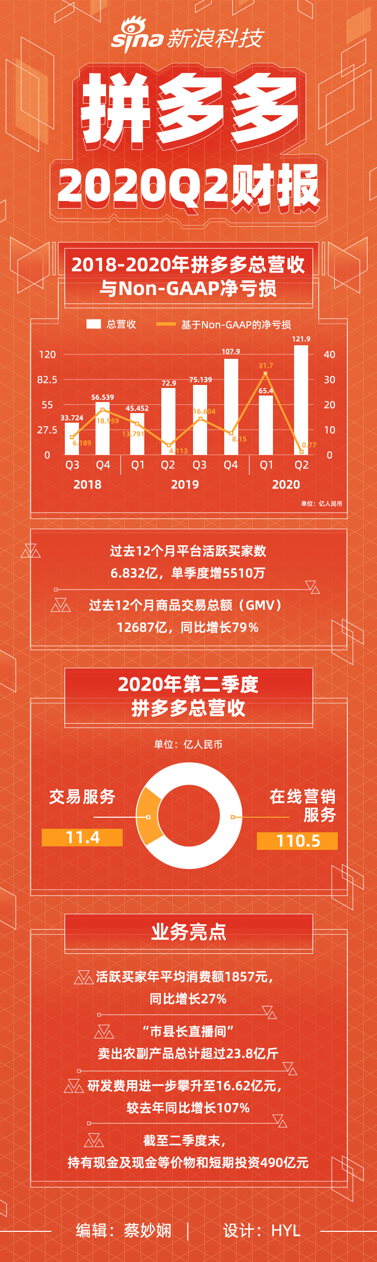北京时间8月21日,拼多多发布2020年第二季度财报。财报显示,第二季度营收121.93亿元,较2019年同期的72.90亿元增长67%,非通用会计准则下,归属于普通股股东的净亏损为7724万元,对比去年同期为净亏损4.11亿元。